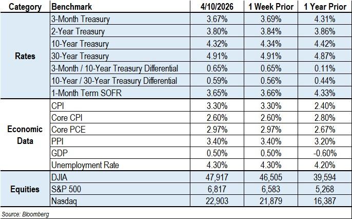- Rates were volatile, but the week ended with a mixed signal rather than a one-way selloff. At the Friday close, the 10-year Treasury yielded 4.32%, the 2-year 3.80%, and the 30-year 4.91%. The 10-year and 2-year were down on the week, while the 30-year was flat, a sign that growth worries partially offset inflation fear in the front and belly of the curve even as the long end stayed sticky.