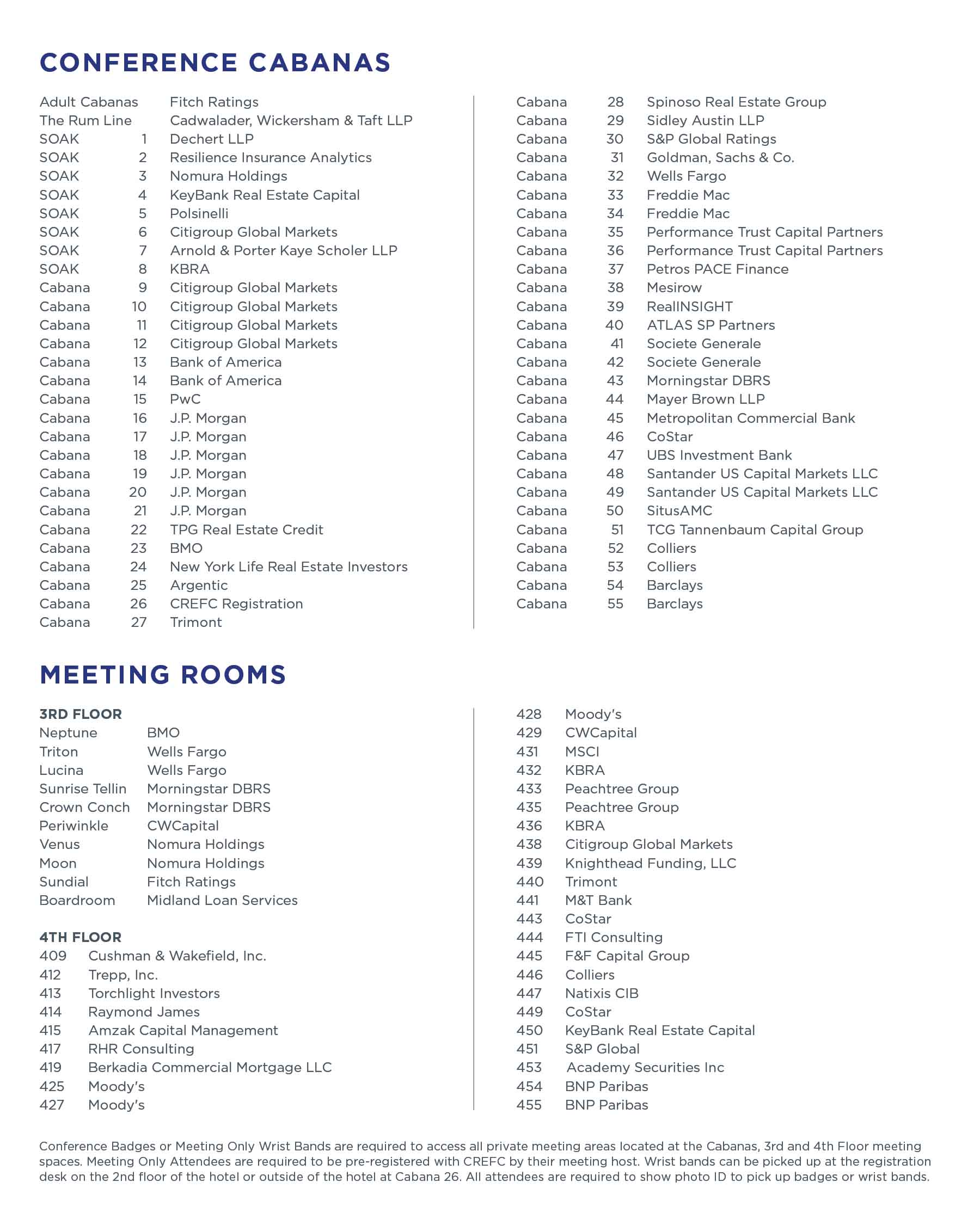 Conference Badges or Meeting Only Wrist Bands are required to access all private meeting areas located at the Cabanas, 3rd and 4th Floor meeting spaces. Meeting Only Attendees are required to be pre-registered with CREFC by their meeting host. Guests who are not pre-registered by their meeting host will be required to be escorted to the meeting space by their meeting host. CREFC will not accept on-site Meeting Only registrations without approval from a designated meeting host.