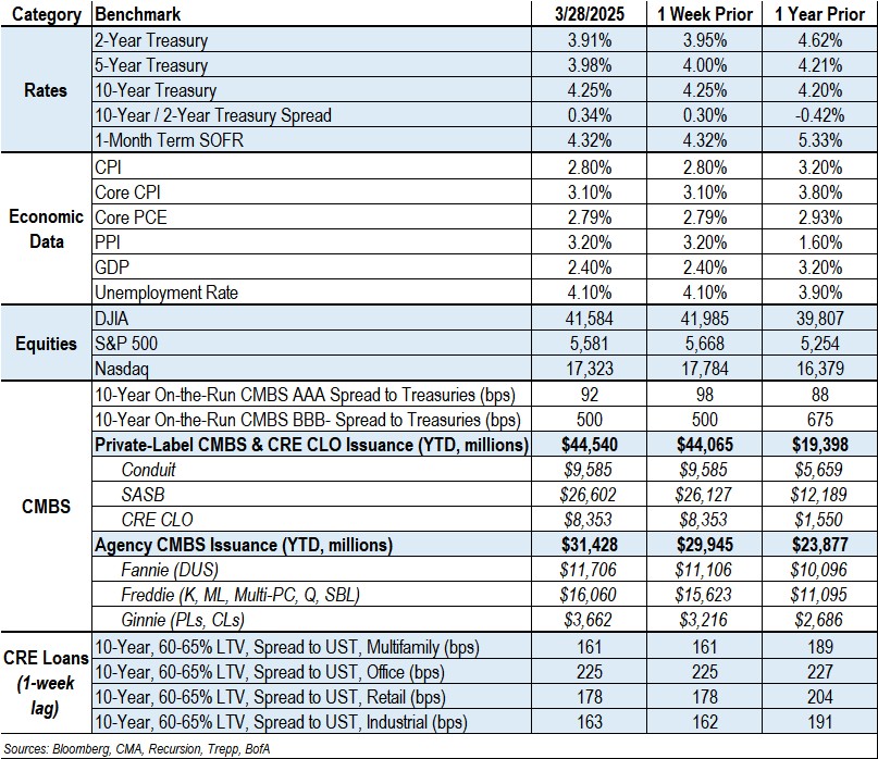 - Last week’s sole transaction was the SKY 2025-LINE, a $475 million SASB backed by a floating-rate, five-year loan (at full extension) for Hudson Pacific Properties (HPP) on six Class-A office properties totaling 1.4 million sf in California and Washington.