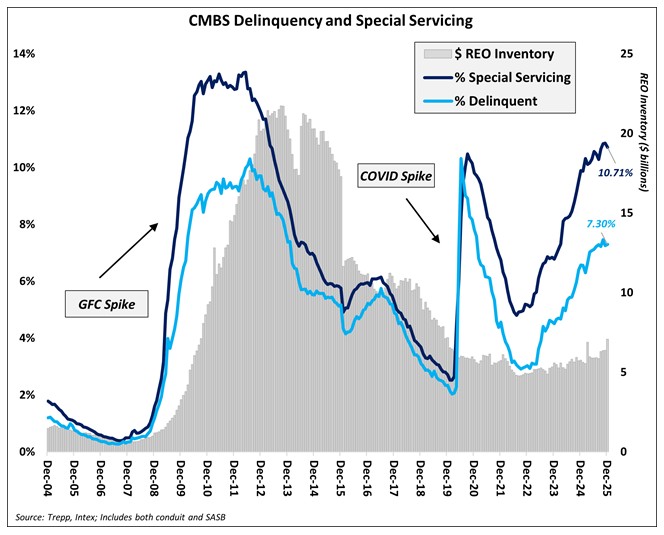 - When including performing matured balloons (loans current on payments but past maturity), the effective delinquency rate rises to 8.75%—signaling that extension and modification activity is masking underlying refinancing stress