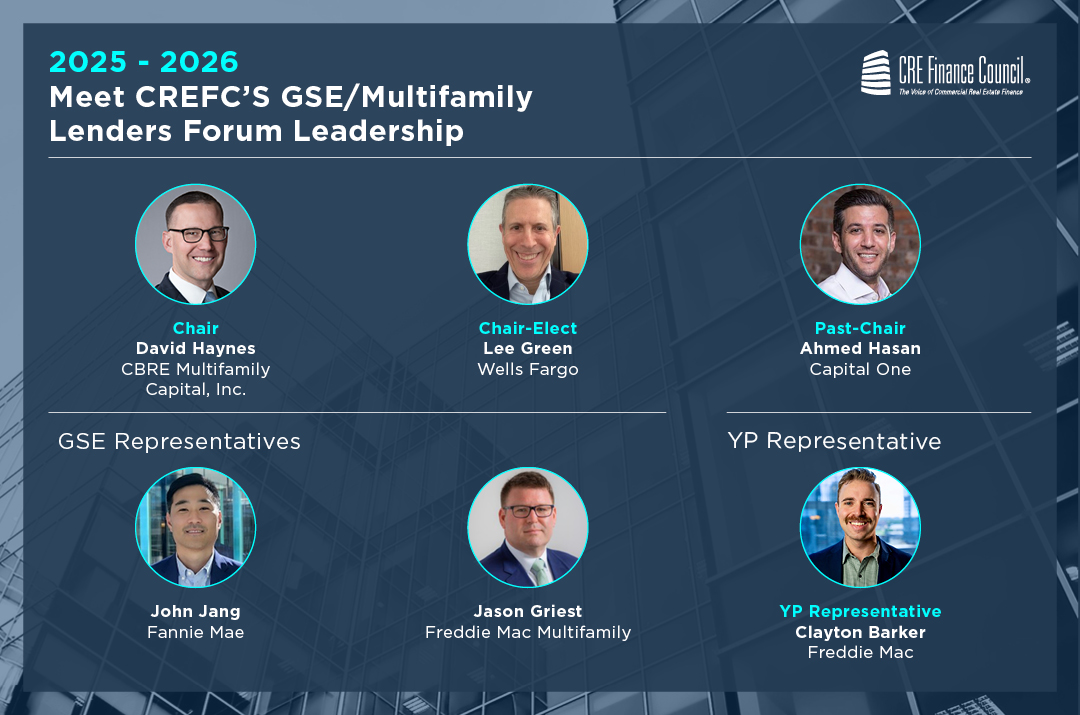 Ahmed Hasan (Forum Chair), David Haynes (Chair-Elect), and Kate Whalen (Past Chair), as well as Jason Griest and Alonzo White (both GSE representatives), form the “Leadership Working Group” of CREFC’s GSE/Multifamily Lenders Forum.